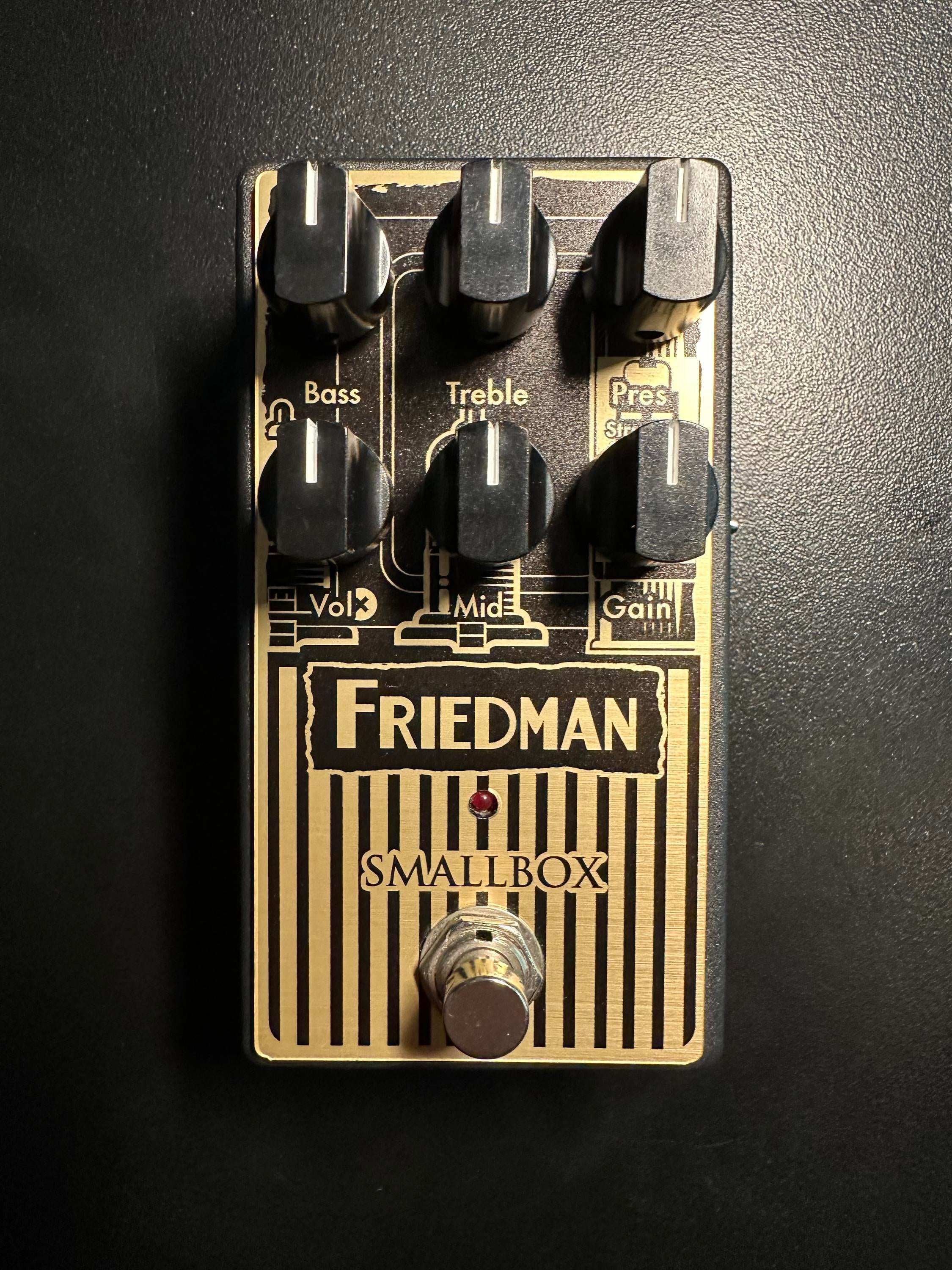 Friedman Smallbox Overdrive. Typical Friedman construction and sonic quality level. Pedal version of the amp that provides realistic plexi tones (but with more available gain) or a more modern Marshall style amp gain with the flick of a switch. The pedal can go from low gain/boost to medium crunch to high gain. With the full tone stack, you can shape it to any amp and go from scooped rhythm tones to fat or searing leads. Cleans up great with just volume knob but retains clarity.