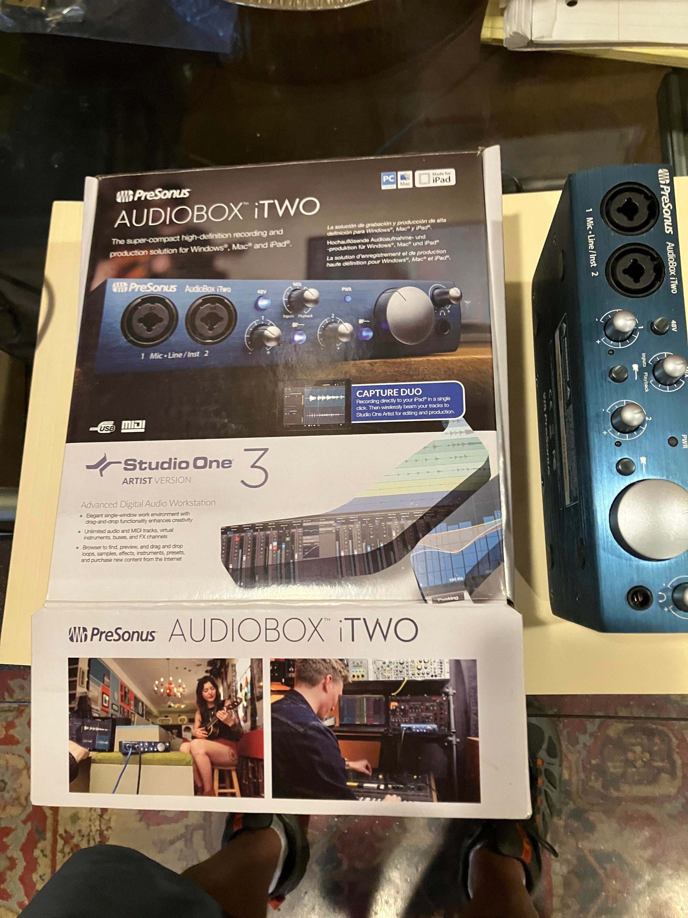 Bring your studio with you and record wherever you go! The two-channel PreSonus® AudioBox® iTwo lets you capture voices, guitars, and line-level sources on macOS, Windows and iPadOS devices. Simply plug in, and you're ready to create! USB bus-powered and bundled with powerful, easy-to-use recording software, the AudioBox iTwo makes it easy to capture ideas and create professional-quality recordings.