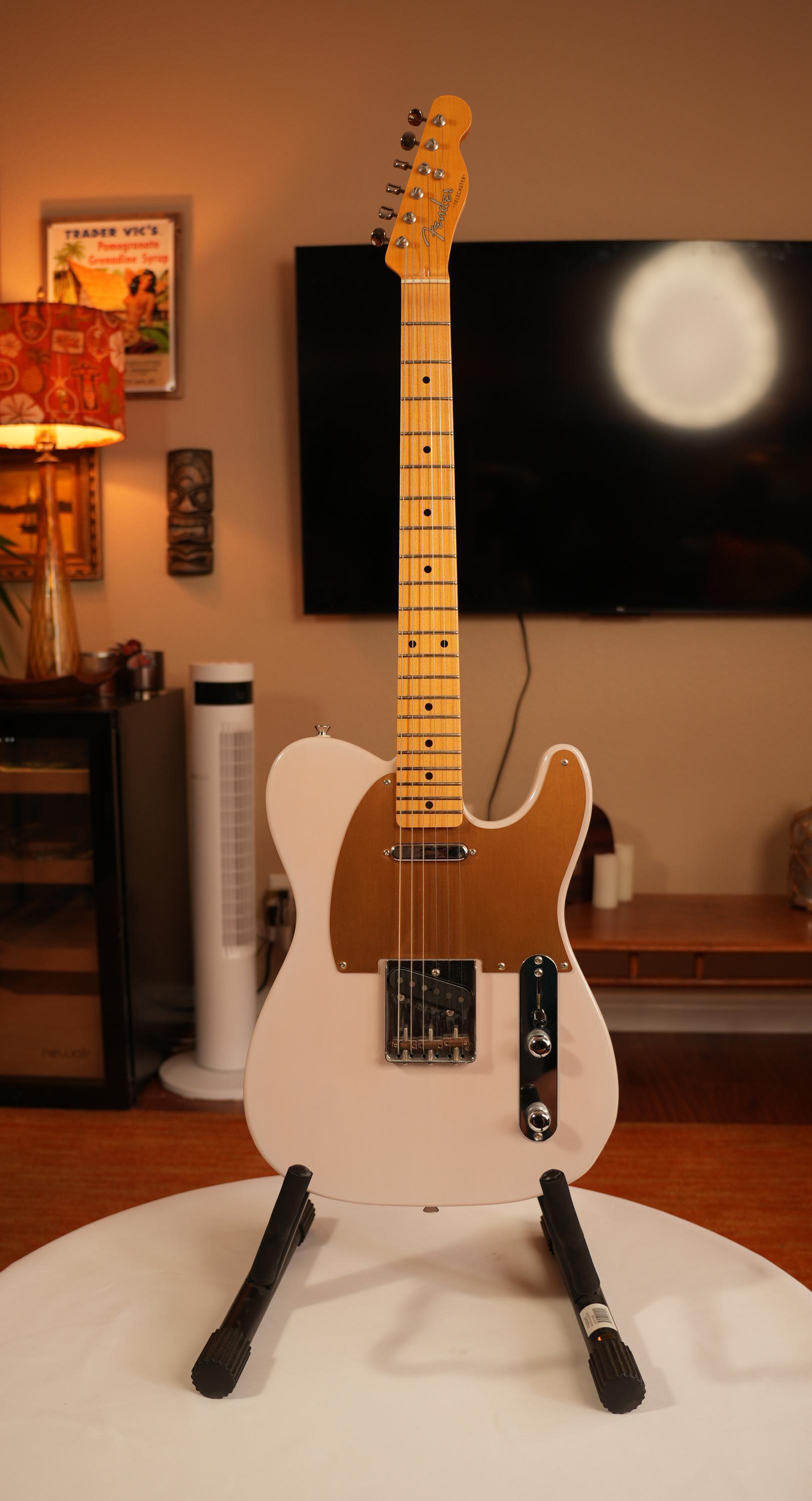 The guitar is in excellent condition, showing only minimal signs of use. The White Blonde finish perfectly complements the gold anodized pickguard and the vintage-tinted maple neck.