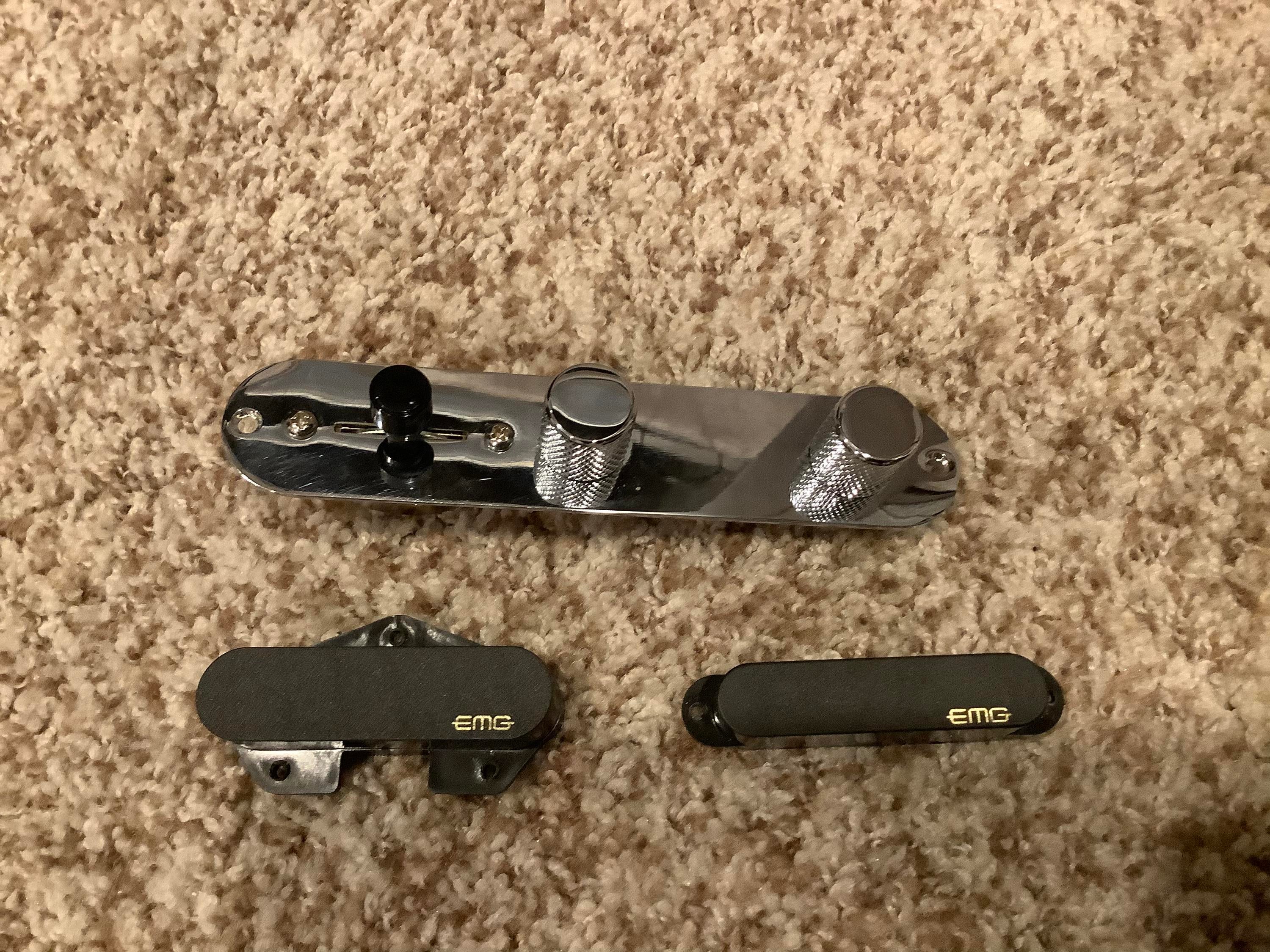 EMG tele system. These pickups are Alnico slightly hotter than vintage but retain the classic single coil tele sound. The big advantage of them being active is how quiet they are, and how articulate they are. Absolutely whisper quiet and extremely clear. I purchased this system in 2018. It is in mint condition with all its original components and packaging, everything necessary for a complete and quick install. No soldering, just plug and play. The tele this was installed into has hung on my wall for years and was never gigged or transported. There is not a scratch on the control plate. And the 9volt battery fits easily in the wiring cavity underneath the control plate, traditional 3 way switching.