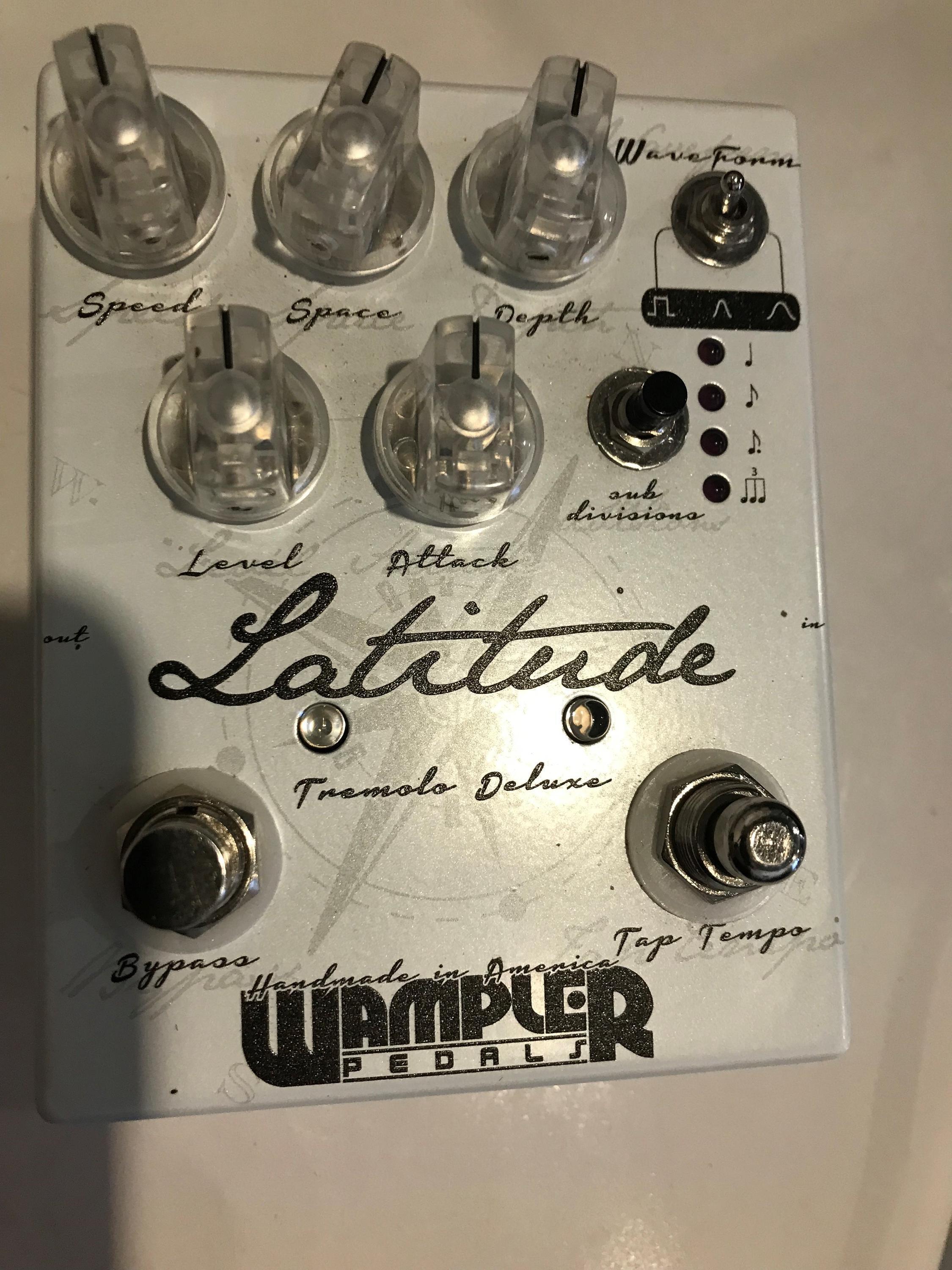 Slightly used Wampler Latitude Deluxe Tremelo in excellent function and production capability. This Tremelo can do it all and is really a tremelo modulation machine. I used it for a few songs that required Fender type tremelo and also for a song with some weird crazy vibe added to dirt pedals. Unfortunately I have to sell many pedals at this time.